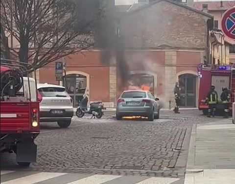 Attimi di paura a Carpi: auto in fiamme di fianco al Duomo