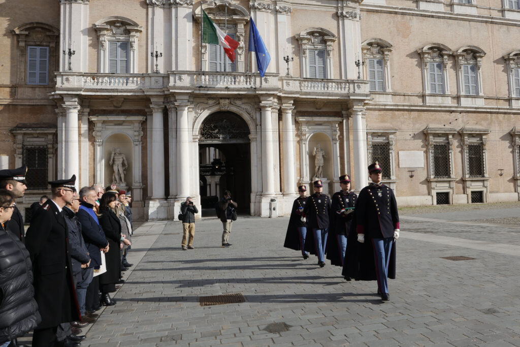 Alla cerimonia hanno preso parte il sindaco Massimo Mezzetti, la prefetta Fabrizia Triolo, il comandante dell’Accademia Militare generale Stefano Messina, il comandante provinciale dei Carabinieri Lorenzo Ceccarelli, la vicesindaca Francesca Maletti, il presidente del Consiglio comunale Antonio Carpentieri e la rettrice di Unimore Rita Cucchiara, oltre ad altri rappresentanti delle forze dell’ordine, a parlamentari e ad amministratori regionali e comunali. Di fronte alla facciata del Palazzo Ducale, con il Reggimento Allievi dell’Accademia Militare schierato su tre blocchi, quattro allievi hanno issato la bandiera italiana e quella dell’Unione europea sui pennoni collocati in piazza, nei pressi di largo San Giorgio.